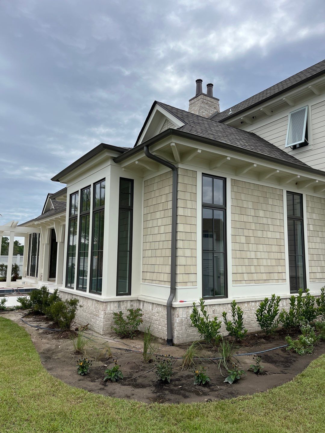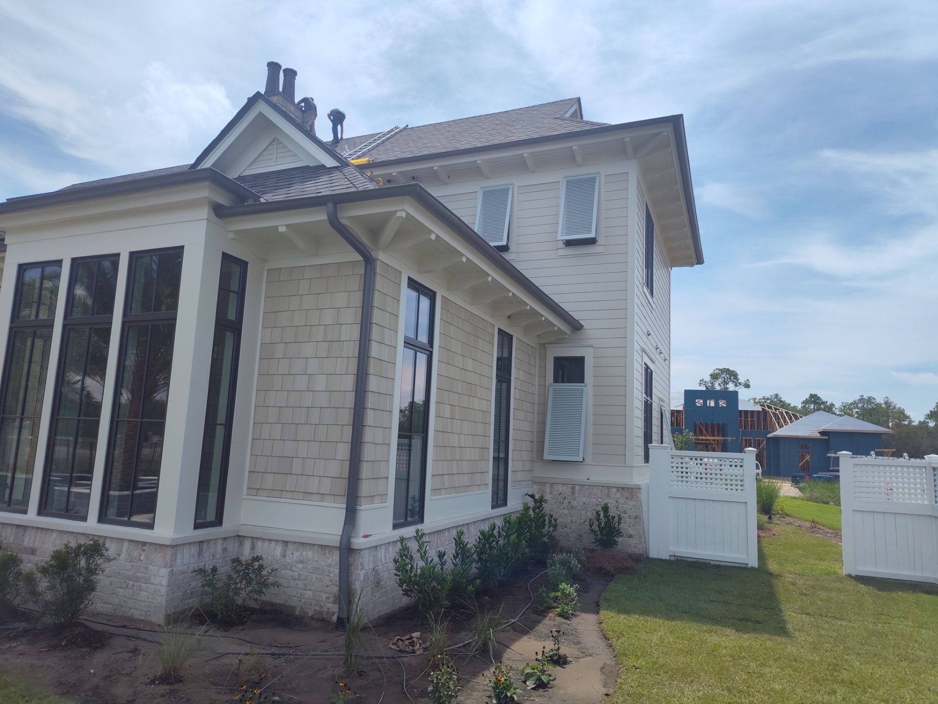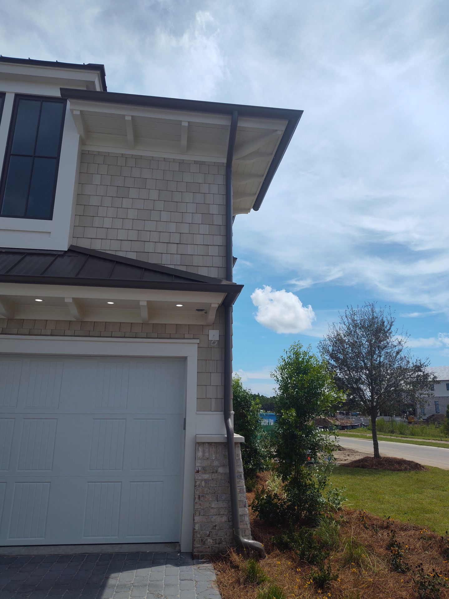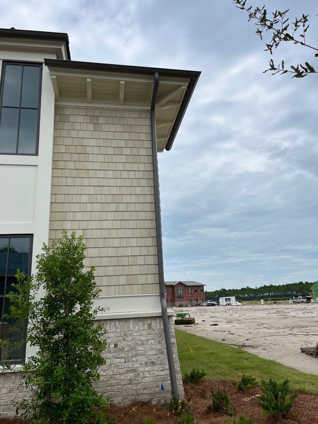 Recently Completed Gutter Installation in Watersound Camp Creek. This project includes approximately 600 linear feet of buried drainage and over 500 linear feet of gutters. We installed 6″ corrugated trunk lines with 4″ branches connected to all of the downspouts to take all of the roof runoff away from this beautiful home. The gutters are half round aluminum with round downspouts. The builder chose a terratone light bronze to match the roof. We can work closely with you and your builder to provide the best rain management system for your dream home. Contact us today here.