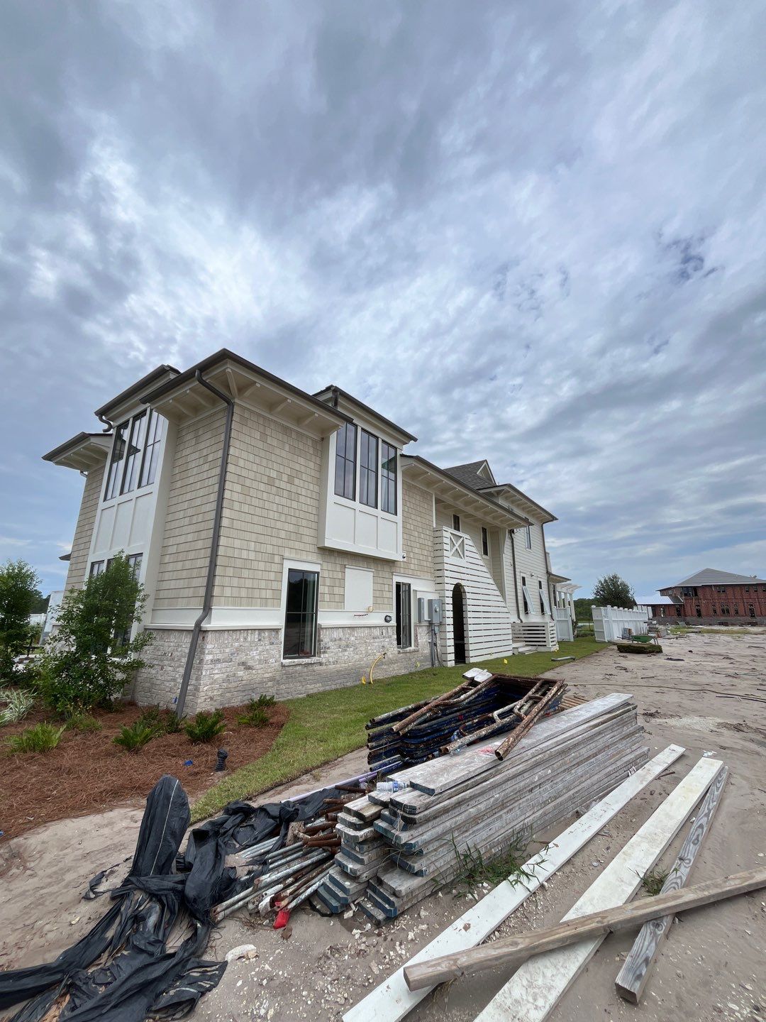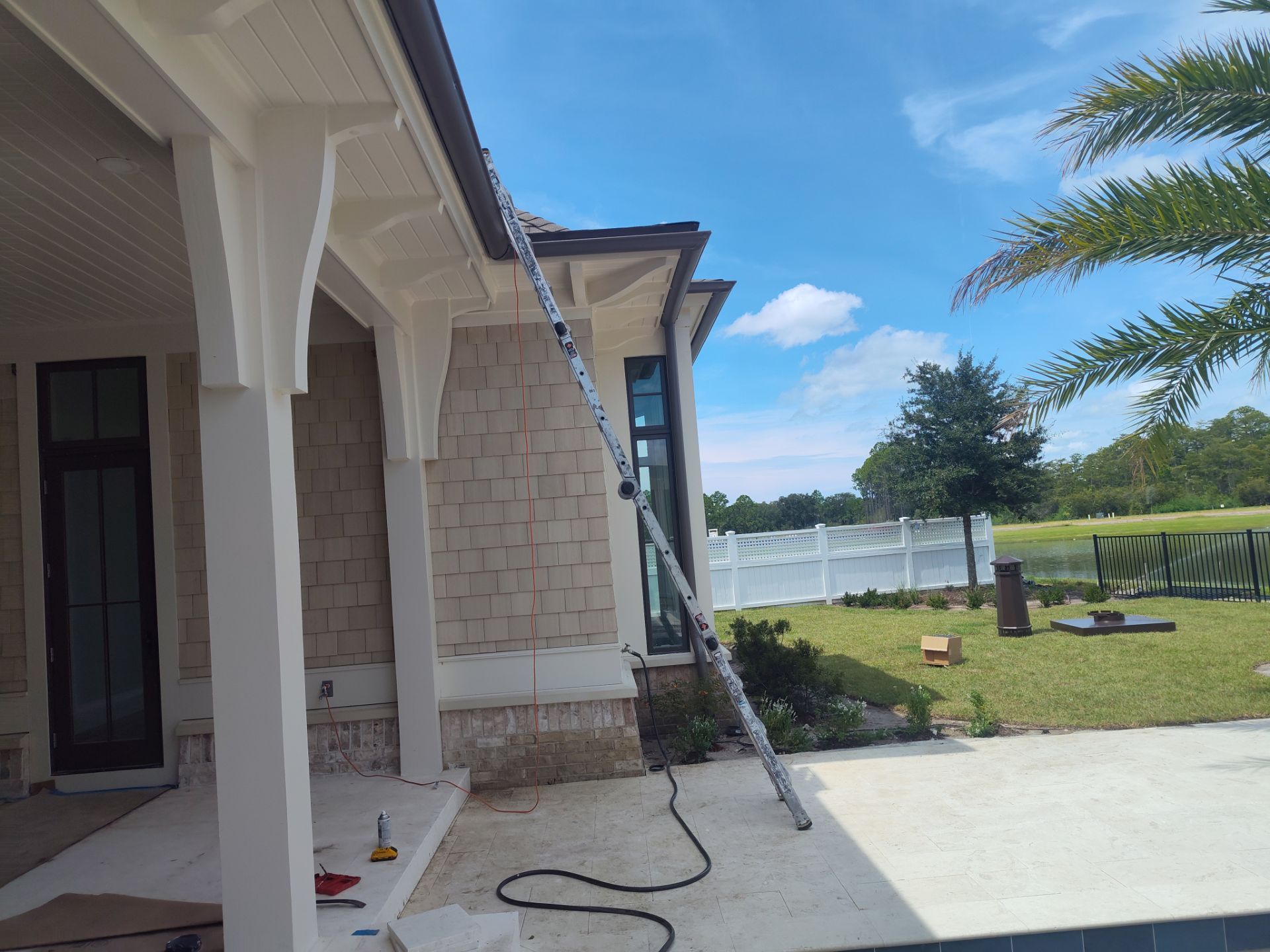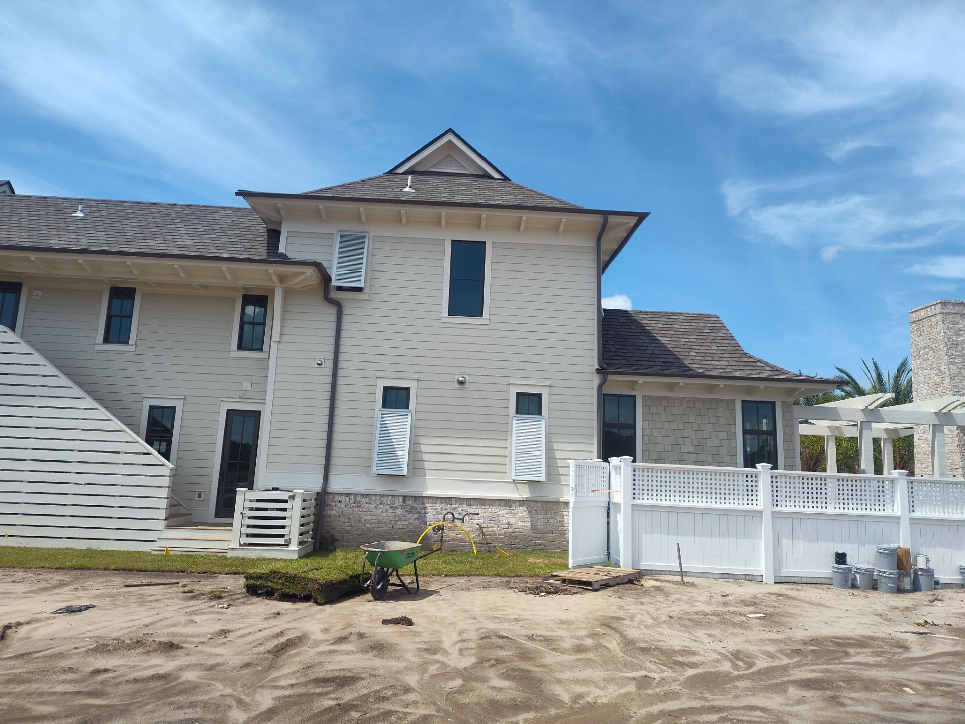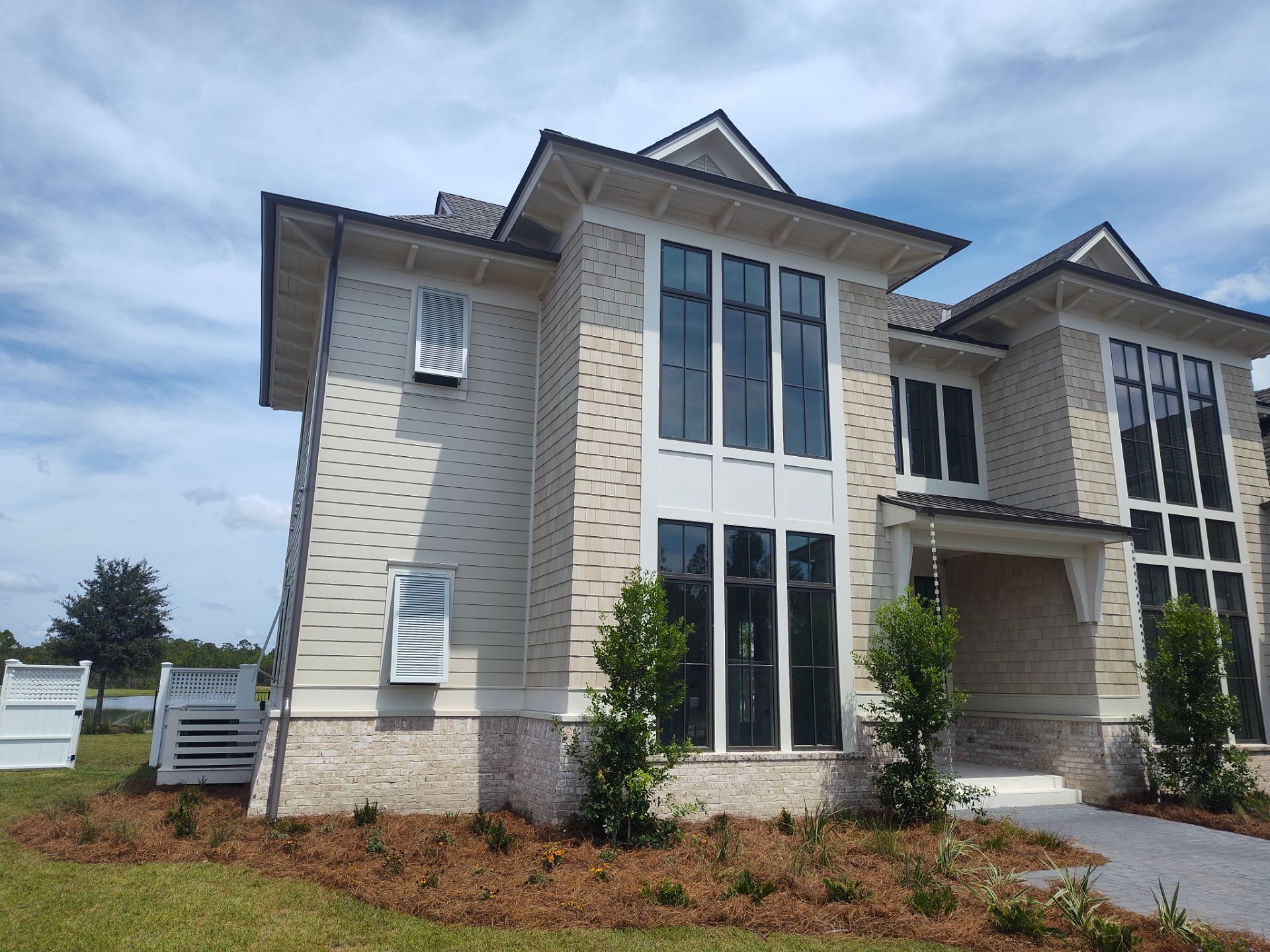 Recently Completed Gutter Installation in Watersound Camp Creek. This project includes approximately 600 linear feet of buried drainage and over 500 linear feet of gutters. We installed 6″ corrugated trunk lines with 4″ branches connected to all of the downspouts to take all of the roof runoff away from this beautiful home. The gutters are half round aluminum with round downspouts. The builder chose a terratone light bronze to match the roof. We can work closely with you and your builder to provide the best rain management system for your dream home. Contact us today here.