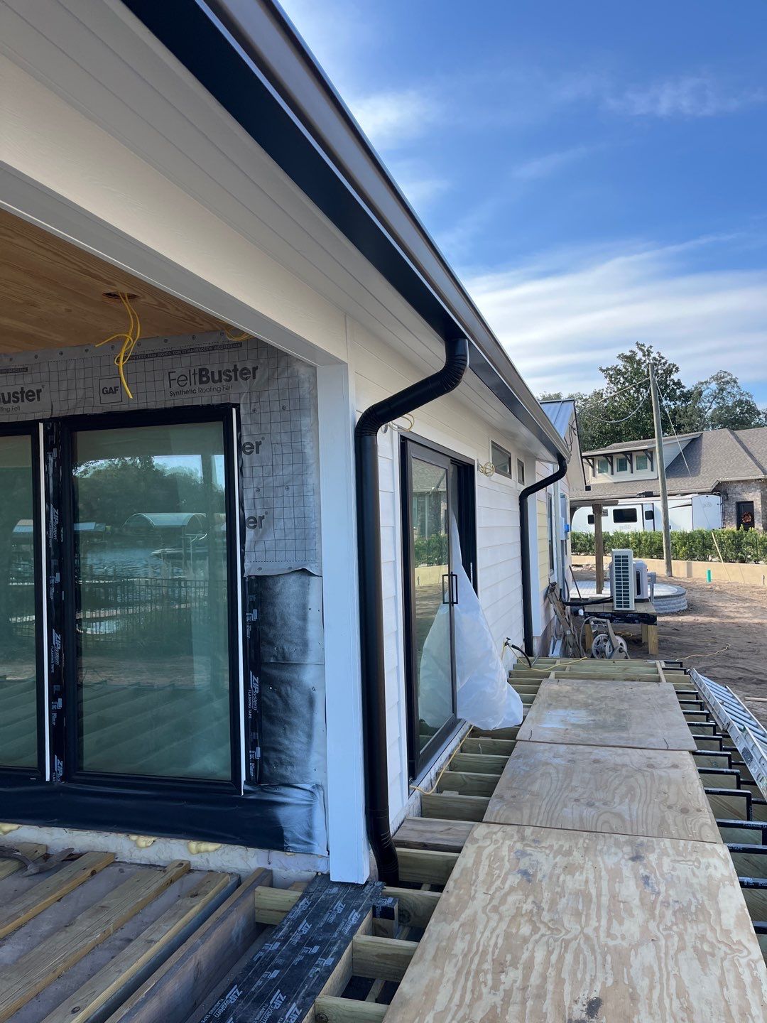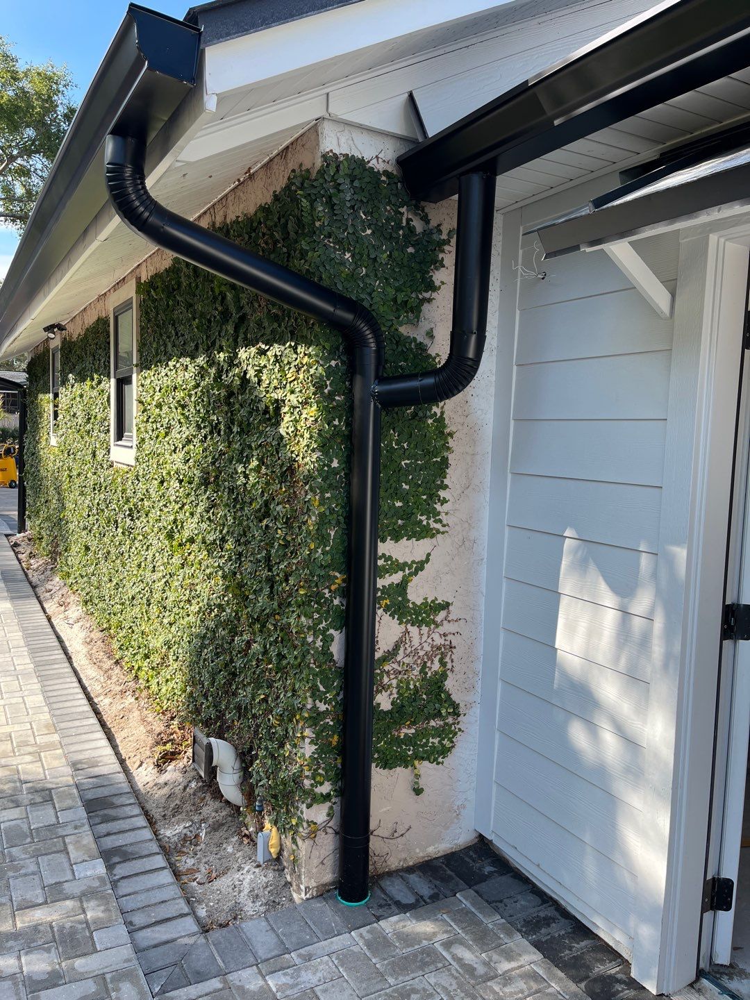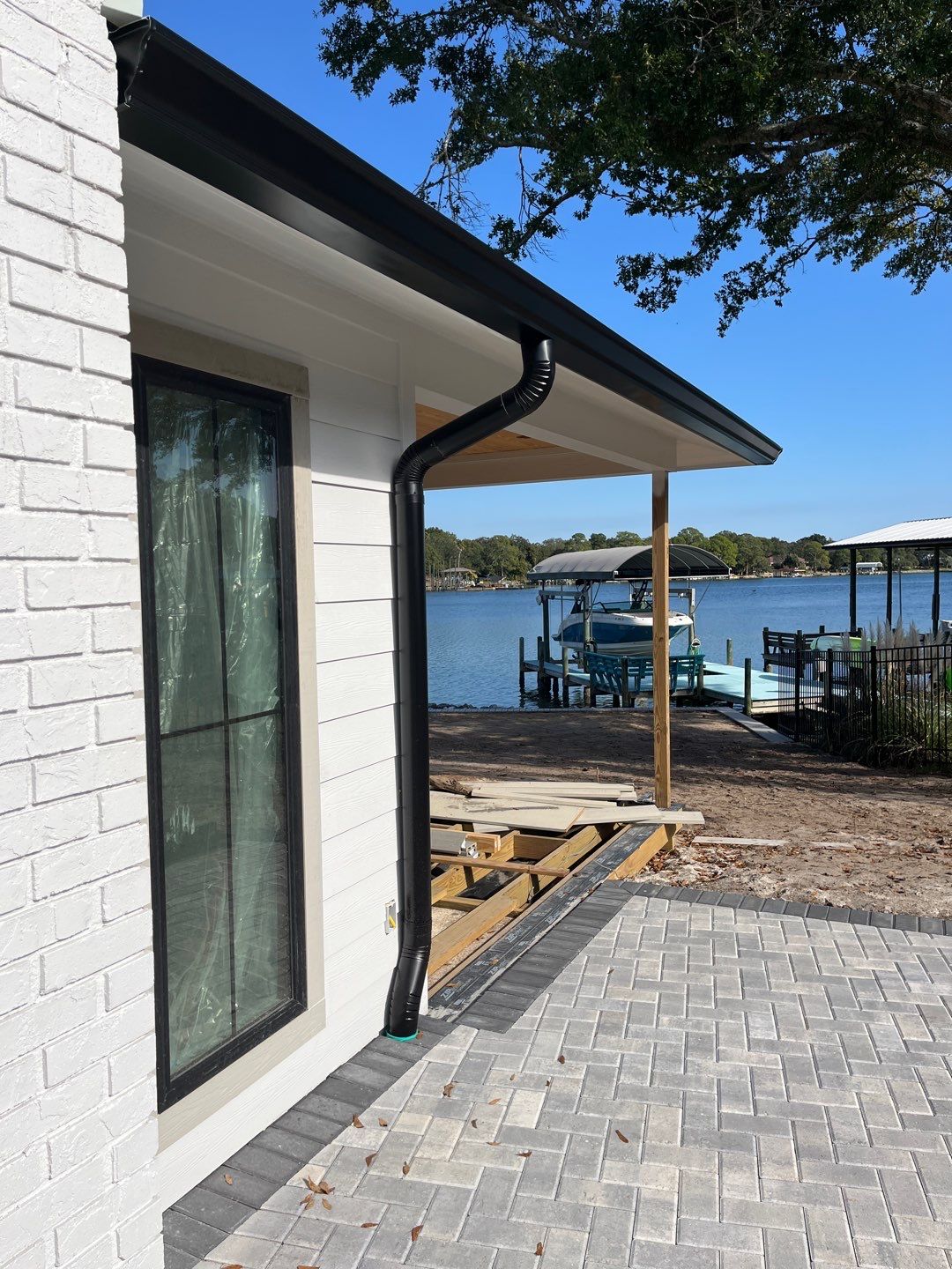 This client chose Black Seamless K style gutters with round downspouts to accentuate the new roof on there newly remodeled home. Form really meets style on this combination. We also added Smartflow leaf protection for a virtually maintenance free rain management system. The system ties into an underground drainage system. This system will protect their investment for many years to come! Call or text us today for your free quote at (850) 273-8770 or click here and fill out the form.